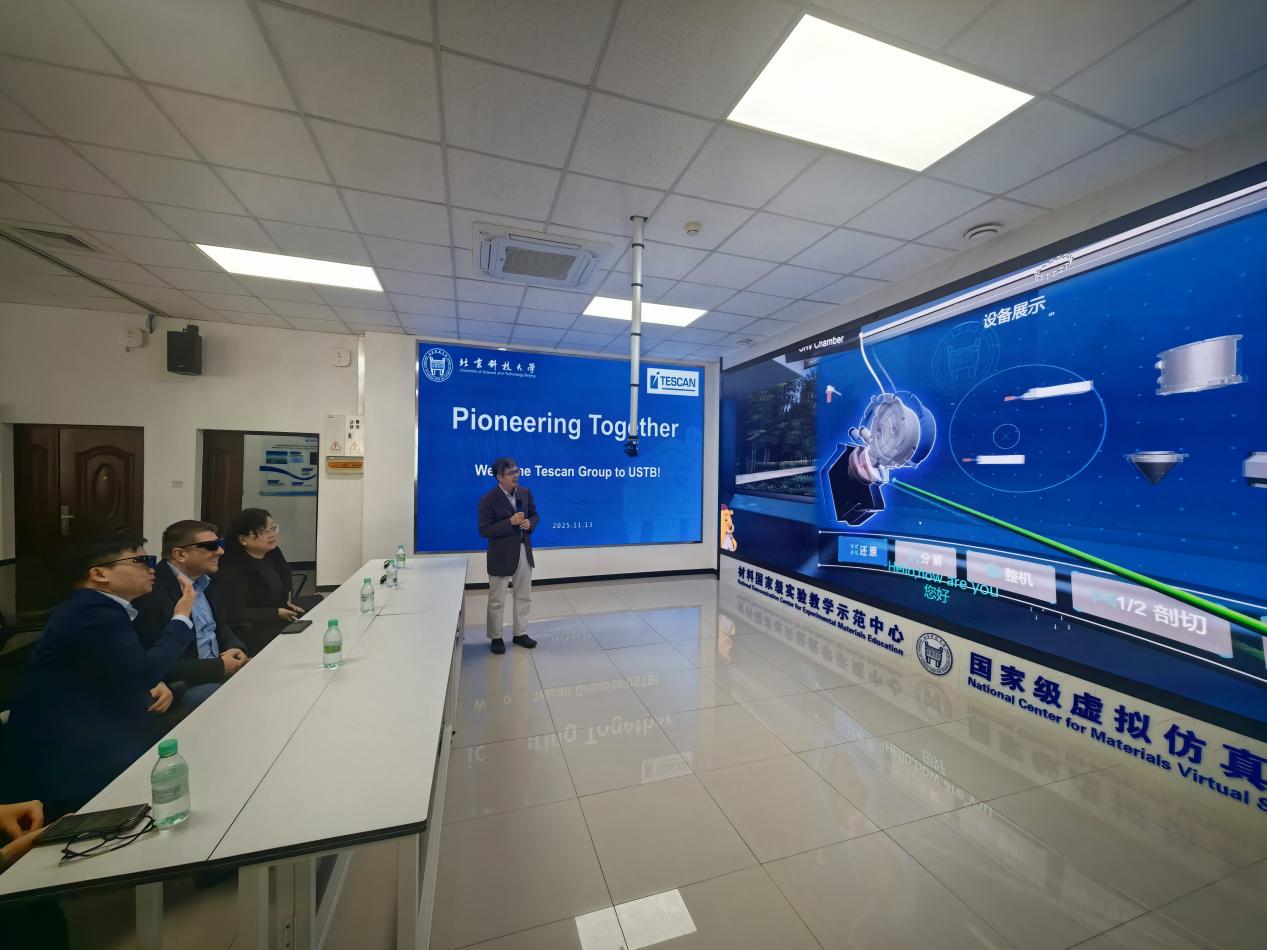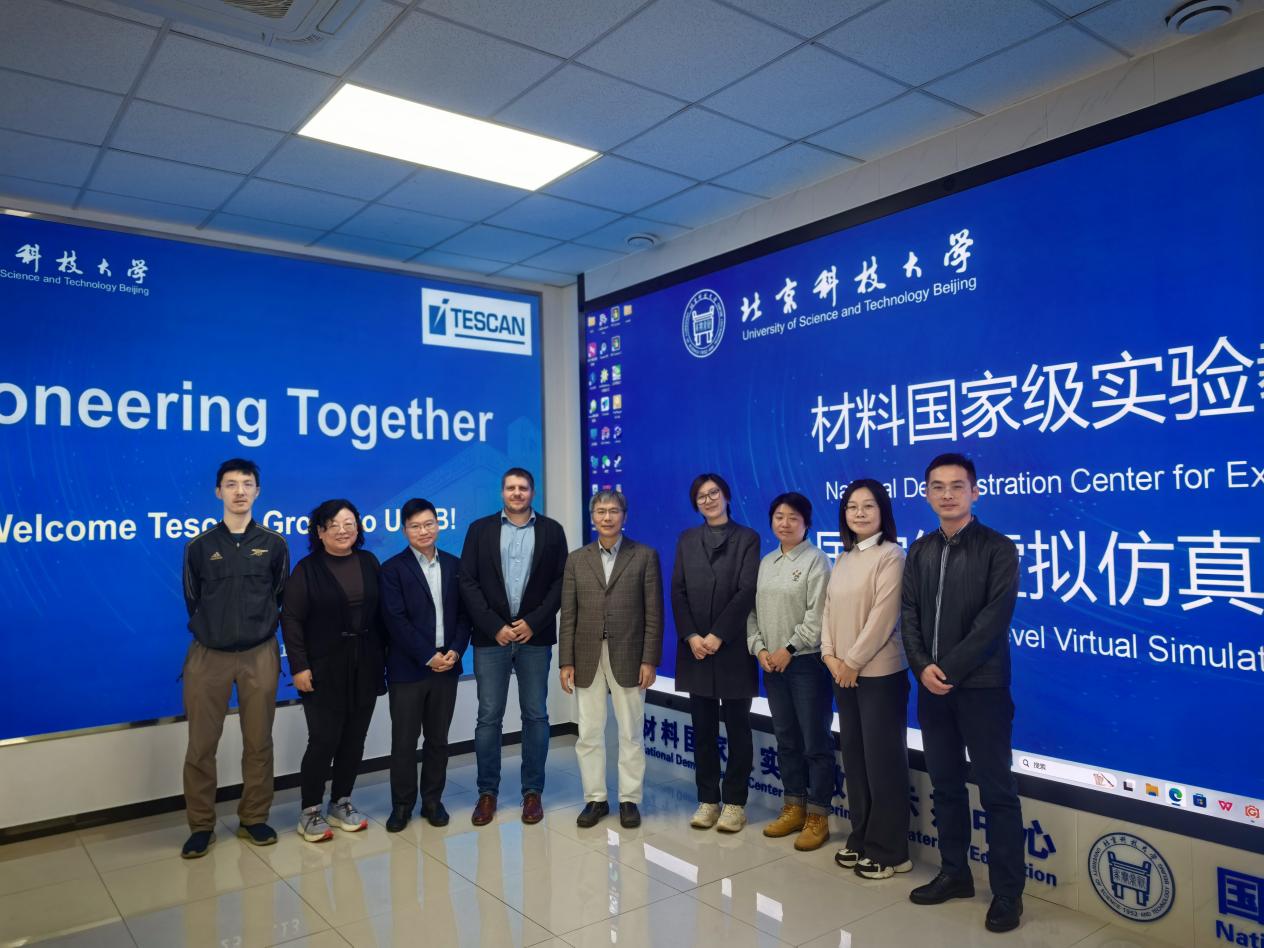 2024年11月13日,国际知名电子显微与微观分析仪器制造商泰思肯集团(TESCAN)电子显微镜业务代表团一行到访北京科技大学材料科学与工程学院实验中心,就扫描电镜技术发展与数智化教学应用展开专项交流。代表团由TESCAN中国区总经理刘利亚、电子显微镜业务部经理VratislavKostal博士、区域销售总监刘凌玉组成。